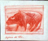 Agonía del toro En el centro del dibujo enmarcado en el que destacan los colores rojizos se puede apreciar a un toro de perfil y corpulento en plena agonía