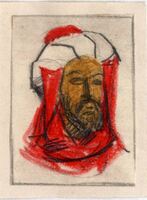 ABDERRAMAN III. Se ha representado como imagen en este dibujo el busto de un árabe. Su cabeza se envuelve en turbantes de tela roja y en un gorro blanco. La cara del personaje musulmán adquiere tonos castaños y una barba oscura y espesa, al igual que sus ojos y cejasBoceto realizado para la ilustracion de la revista semanal de Novelas y Cuentos. Titulo: Abderraman III; Autor: Mariano Tomás; Nº public. 1341; fecha 20-01-1957; Tomo: 50; PI/. No