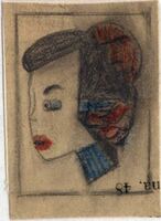 Na, 84 Con los rasgos muy marcados se representa el retrato de una joven con la piel muy blanca y el pelo oscuro recogido en un moño, labios semiabiertos rojos, ojos azules y el cuello azul . La figura aparece medio de perfil, ya que la cabeza está ligeramente torcida. En su pelo se adivina el dibujo de un hombre empuñando un revolver saliendo parte del cañón por el ojo izquierdoBoceto realizado para la ilustración de la revista semanal Novelas y Cuentos. Titulo. Autor: Nº publicado: Fecha: Tomo NC.: