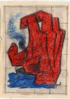 NIEBLA. De las aguas del mar tan azules surge una gran y amenazadora mano roja medio cerrada impidiendo el paso de lo que parece ser un barco adivinado por una mancha negra y el humo azulado que desprende. Hacia el lado izquierdo e inferiormente se puede apreciar la firma del pintor. La superficie del dibujo enmarcado se halla cuadriculada.Boceto realizado para la ilustración de la revista semanal Novelas y Cuentos. Titulo: Niebla. Autor: V. William y D. Rice. Nº publicado: 1340. Fecha: 13-01-1957. Tomo NC. 30.