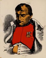 Napoleón. En este retrato firmado por su autor se ha representado a Napoleón, el gran militar francés. Lleva una chaqueta roja, sobre la que se aprecian algunas condecoraciones, y, por encima, una capa blanca. Una de sus manos la envuelve en dicha capa. Su semblante es serio. Su piel oscura y el pelo negro.Prueba de imprenta. Ilustración realizada para la revista semanal Novelas y Cuentos. Titulo: Napoleón; Autor: A. Martinez Olmedilla; Nº publicado: 1199; Fecha: 02-05-54; Tomo NC.31