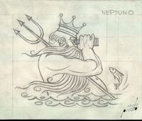 Neptuno En este dibujo donde destacan los tonos grisáceos se ve la figura de Neptuno con su tridente cogido por un brazo y una corona sobre su cabeza, en posición de perfil saliendo de las aguas del mar mirando por un catalejo. En el fondo se aprecia una superficie ligeramente cuadriculada.
