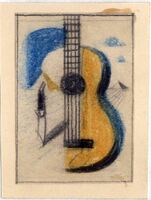 NOCHE DE LEVANTE EN CALMA Se ha tomado una guitarra española como temática central del dibujo enmarcado. En pie y verticalmente aparece muy bien delimitada la imagen en su lado izquierdo mientras que en su lado derecho parece simularse el instrumento mediante figuras no definidas. Los colores predominantes son el blanco, azul y amarillo.Boceto realizado para la ilustración de la revista Novelas y Cuentos. Titulo: Noche de Levante en Calma. Autor: José María Peman. Nº publc. 915 Fecha: 21-11-1948. Tomo NC. 20. PI/. 487