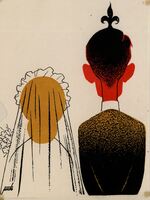 ORGULLO DE CASTA. Una pareja que se encuentra de espalda se casa. Ella, en el lado derecho, lleva un velo blanco sobre su cabeza de pelo rubio y él, a la izquierda, lleva un traje negro y una flor de lis sobre su cabeza de pelo oscuro. La composición está firmada.Prueba de imprenta. Ilustración realizada para la revista semanal No velas y Cuentos. Titulo: Orgullo de casta. Autor: M. Maryan. Nº publicado: 1215. Fecha: 22-0-1954. Tomo NC. 45.