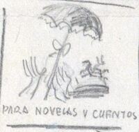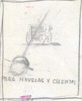 Para novelas y cuentos 4 “Para novelas y cuentos” a modo de boceto y en donde se destacan los colores grises y blancos se ha dibujado, saliendo de la parte de la derecha, una mano que sostiene una espada. En un segundo plano se ve a un carro de caballos. Una línea torcida y abocetada intenta crear un marco al dibujo.