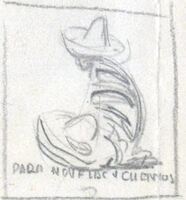 Para novelas y cuentos 2 En un boceto ha dibujado el pintor la imagen de un hombre sentado con traje y sombrero mejicano. Se ve, también, la imagen de otro hombre al que solamente se le ve el sombrero. Predomina el color blanco y gris. Líneas torcidas y abocetadas intentan enmarcar el dibujo.