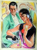 Pareja de bailarines Una pareja de bailarines aparece en primer término. El hombre va vestido con un traje en negro y blanco mientras que la bailarina, una joven rubia, lleva un vestido largo de color fucsia. Una escena en la que se aprecia el movimiento de la danza. El dibujo se encuentra enmarcado.Boceto realizado para la ilustración de la revista Novelas y Cuentos: Titulo: Autor: Nº publicado: Fecha Tomo NC/. No; Prueba de Imprenta 446