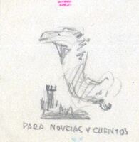 Para novelas y cuentos 3 Para esta composición en blanco y gris ha dibujado el pintor lo que parece un caballo de mar y en un segundo plano, de tamaño pequeño, un torreón de castillo.