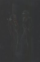Pareja hablando en la noche Imagen sobre fondo oscuro con los contornos claros de dos figuras, una mujer apoyada sobre una pared frente a un hombre con sombrero y manos en su bolsillo, hablando tranquilamente en la calle. .