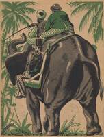 Pasajeros sobre un elefante En un paisaje de verdes matorrales camina un gran elefante gris de espalda con dos pasajeros también de espalda y con el traje verde.Prueba de imprenta. Ilustración realizada para la revista semanal Novelas y Cuentos. Titulo: Autor: Nº publicado: Fecha: Tomo NC.: