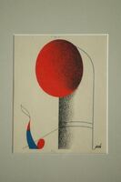 Partir … Una chimenea de barco, el boquete pintado de rojo y sombreado en negro, en la parte inferior se dibuja un personaje que con un pañuelo está despidiendo al barco, el personaje pintado la cabeza y una mano de rojo, traje de azul. La firma se encuentra en la parte inferior derecha.Prueba de Imprenta. Ilustración realizada para la revista semanal de Novelas y Cuentos. Titulo: Partir. Autor: Roland Dorgeles. Nº publicado: 1293. Fecha: 19-02-1956. Tomo NC. 46.