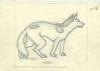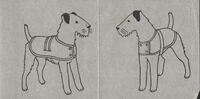 Perro Dibujo de un perro blanco con las orejas negras, retratado en dos posiciones diferentes, con un peto canino sobre su lomo. Es tan geométrico que es posible que se trate de un diseño para un juguete, por ejemplo.