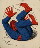 PESADILLA. Un hombre con el traje azul y los pies descalzos está atrapado e una red de la que intenta liberarse ayudándose de sus manos. En el dibujo se aprecia la firma del pintor.Prueba de imprenta. Ilustración realizada para la revista semanal Novelas y Cuentos. Titulo: Pesadilla. Autor: Erckmann Chatrian. Nº publicado: 1120. Fecha: 26-10-1952. Tomo NC. 36.