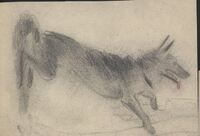 Perro Dibujo a lápiz, de un perro apoyado sobres sus patas delanteras y en el aire las traseras, momento que capta el salto del perro, que ocupa todo la escena, realizado con una técnica muy libre.