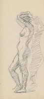 Perfil de mujer con los brazos sobre la cabeza Un apunte del desnudo de una mujer de perfil, con la cabeza entre sus brazos. Creando sombras con líneas de trazos cortos y paralelos. La repetición de unos mismos modelos nos habla de un quehacer repetitivo en el taller.
