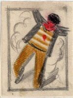 POR UN MILAGRO DE AMOR. En el dibujo enmarcado un hombre se balancea con los brazos hacia arriba. Su traje se compone de un pantalón amarillo, camiseta a rayas blancas y amarillas, un gorro oscuro al igual que su chaqueta. De su pecho le sale una mancha roja como si se tratase de una herida del corazón, o el corazón mismo. La piel de su cara adquiere un tono rojo oscuro.Boceto realizado para la ilustración de la revista semanal Novelas y cuentos. Titulo: Por un milagro de amor. Autor: J. López Saa. Nº publicado: 1298. Fecha: 25-03-1956. Tomo NC.: 37. PI/. 216