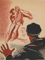 POR UN MILAGRO DE AMOR. En la composición, en la que se vislumbra la firma del pintor, se ha dibujado a un personaje que se tambalea con los brazos abiertos. Lleva un pantalón marrón claro, una camiseta blanca y una chaqueta negra. Sobre la camiseta blanca se puede apreciar una mancha roja dejando adivinar una herida mortal. Sobre su cabeza lleva un sombrero negro y en su boca sostiene un cigarro.Prueba de imprenta. Ilustración realizada para la revista semanal Novelas y Cuentos. Titulo: Por un milagro de amor. Autor: J. López Saa. Nº publicado: 1298. Fecha: 25-03-1956. Tomo NC. 37.