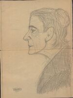 Retrato de mujer anciana Destaca en lado izquierdo de este dibujo el retrato de una mujer de perfil, anciana, con el rostro delgado y con un moño atándole el pelo blanco. El dibujo está firmado.