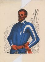 Retrato de personaje desconocido Sobre un fondo en el que destacan matorrales grisáceos se ha realizado el retrato de un hombre de frente y de cintura para arriba llevando una armadura azul. sus manos están sobre la cintura donde se encuentra su espada. La composición está firmadaPrueba de imprenta. Ilustración realizada para la revista semanal de Novelas y Cuentos. Titulo: Autor: Nº publicado: Fecha: Tomo NC.