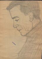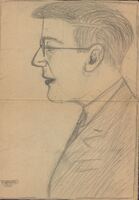 Retrato de hombre con gafas En este retrato firmado se ve la figura de un hombre joven, en el lado izquierdo, de perfil y con gafas. Destacan las líneas grises.