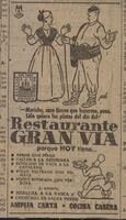 Restaurante Gran Vía 2 Anuncio publicitario correspondiente a la carta de un restaurante de la Gran Vía de Madrid, donde se lee los diferentes platos del día junto al dibujo de las figuras de un hombre y una mujer vestidos con traje regional.