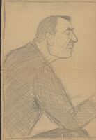 Retrato de un hombre de perfil En líneas grises se ha retratado a un hombre de perfil con traje oscuro. El dibujo está firmado.
