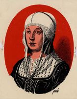 Retrato de una figura femenina desconocida de la realeza Inscrito en un medallón sobre el que hay una corona en tonos amarillos y rojos y una cinta de color rojo se ha realizado el retrato de una mujer desconocida perteneciente a la realeza. La figura está de perfil, su traje es negro y su cabello negro lo recoge en un moño. La firma del pintor está presente en la composición.Prueba de imprenta. Ilustración realizada para la revista semanal Novelas y Cuentos. Titulo: Autor: Nº publicado: Fecha: Tomo NC.:
