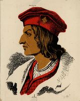 Retrato de un personaje desconocido Se ha representado en este retrato a un personaje masculino de perfil. Su semblante es serio, su piel muy morena y su cabello marrón es largo dejándolo caer sobre sus hombros. Sobre su cabeza lleva un sombrero rojo y en su vestimenta se aprecian los colores rojo y blanco. En la composición está presente la firma del pintor.Prueba de imprenta. Ilustración realizada para la revista semanal Novelas y Cuentos. Titulo: Autor: Nº publicado: Fecha: Tomo NC.