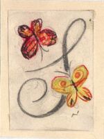 SALVADORA OLBERA. En el dibujo enmarcado donde se vislumbra el boceto de la firma del pintor revolotean dos mariposas alrededor de una “s” muy estilizada y caligráfica de color negro. Las mariposas son pequeñas y de color amarillo y rojizo, respectivamente.Boceto realizado para la ilustración de la revista semanal Novelas y Cuentos. Titulo: Salvadora Olbera. Autor: Azorin. Nº publicado: 997. Fecha: 18-06-1950. Tomo NC. 26.