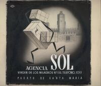 Agencia Sol Sobre un fondo oscuro se abre una escena enmarcada por un círculo con la imagen de una caja de embalaje caracterizada con piernas y brazos que lleva unos paquetes en sus manos, detrás la silueta de una ciudad.