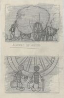 Acarreo de mieses Dos dibujos se hallan separados cada uno por su enmarque. En el primero unos hombres colocan las mieses en un carro, mientras que en el segundo, al lado de una rueda, se encuentran dos insectos con una maleta cada uno. Destacan los colores grises y el lema se sitúa en medio de los dibujos.