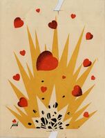 Alcala de los Zegries. Una gran explosión es lo que parece desarrollarse en este dibujo firmado por su autor en el que destacan los colores amarillo y negro. Sobre ese fondo amarillo se pueden ver numerosos corazones rojos.Prueba de imprenta. Ilustración realizada para la revista semanal Novelas y cuentos. Titulo: Alcalá de los Zegries. Ricardo León. Nº publicado: 1113. Fecha: 07-09-1952. Tomo NC.: 37.