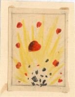 ALCALA DE LOS ZEGRIES. Una explosión hace saltar corazones por el aire. De ella emana una luz amarilla. Inferiormente se ven esparcidos trozos oscuros de algún objeto roto. Toda la escena se encuentra enmarcada.Boceto realizado para la ilustración de la revista semanal Novelas y Cuentos. Titulo: Alcalá de los Zegríes. Autor: Ricardo León. N º publicado: 1113. Fecha: 07-09-1952. Tomo NC.: 37. PI/. 119