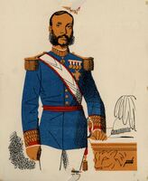 Alfonso XIII En este retrato se ha representado la figura de Alfonso XIII de pie. En él destacan unos pantalones blancos y una chaqueta azul con adornos dorados y una banda blanca sobre su pecho como también se ven algunas condecoraciones. En su rostro crece barba oscura. Su mano izquierda la apoya sobre una mesa en la que también puede verse un gorro con penacho blanco. La firma del pintor puede vislumbrarse en la composición.Prueba de imprenta. Ilustración realizada para la revista semanal Novelas y Cuentos. Titulo: Autor: Nº publicado: Fecha: Tomo NC.