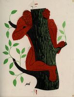 Antes de Adan. Subido a un árbol de tronco verdoso y hojas de un verde más claro se halla un hombre mono con la piel muy oscura y con mucho pelo en su cuerpo. El dibujo está firmadoPrueba de imprenta. Ilustración realizada para la revista semanal Novelas y Cuentos. Titulo: Antes de Adan. Autor: Jack London. Nº publicado: 1126 Fecha: 07-12-52. Tomo NC: 55