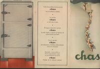 Anuncio de la Nevera Chas 4 Escena compuesta por tres imágenes correlativas relacionadas entre sí, los dos primeros dibujos representa una nevera blanca, objeto del anuncio, sobre un suelo rojo y a su lado la leyenda publicitaria, por último la imagen de una hilera de perros siberianos que tiran de la nevera y detrás de ellas un hombre que asegura la sujeción en el recorrido.