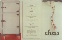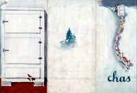 Anuncio de la Nevera Chas 3 Escena compuesta por tres imágenes correlativas relacionadas entre sí, los dos primeros dibujos representa una nevera blanca, objeto del anuncio, sobre un suelo rojo y a su lado la leyenda publicitaria, por último la imagen de una hilera de perros siberianos que tiran de la nevera y detrás de ellas un hombre que asegura la sujeción en el recorrido.