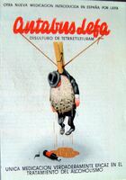Antabus Lefa. Cartel de un nuevo medicamento contra el alcoholismo de los laboratorios Lefa, con la imagen de un hombre ebrio colgado de una cuerda por una pinza, para eliminar todo el alcohol que le sobra que cae formando un charco bajo él.Publicidad realizada para unos laboratorios.