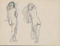 Apuntes de un desnudo de mujer Los dos rápidos apuntes de desnudos de mujer de espaldas nos hacen pensar que se trata de una misma modelo desde dos puntos de vista muy similares. Que en ambos casos la modelo esté apoyada sobre lo que parece una mesa nos hace pensar que se trata de un apunte del natural de una modelo profesional.