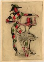 Arlequín y bailarina Dos figuras aparecen en este dibujo ligeramente enmarcado. Un arlequín muy alto con un traje a rombos verdes, rojos y negros sobre fondo blanco llevando en su cabeza un sombrero de tres picos de color negro y verde. Sus manos sostienen a una bailarina de aspecto muy joven con traje blanco y sus zapatillas rojas.Boceto realizado para la ilustración de la revista Novelas y Cuentos. Titulo: Autor: Nº public.: Fecha: Tomo NC.: PI/. 372