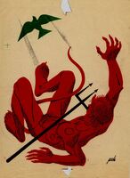 ARREPENTIMIENTO. En este dibujo firmado se encuentran dos figuras: un pájaro verde en la parte superior y en la parte inferior un demonio rojo con su tridente negro cayendo de espalda.Prueba de imprenta. Ilustración realizada para la revista semanal Novelas y Cuentos. Titulo: El arrepentimiento. Autor: George Eliot. Nº publicado: 958. Fecha: 13-09-1949. Tomo NC. 17.