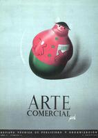 Arte Comercial 3 Cartel de Arte Comercial, sobre un fondo claro la figura de un muñeco tentempié sonriente, coloreado en rosas y verdes, con la leyenda en la parte inferior sobre un fondo negro. La firma está en blanco.