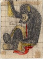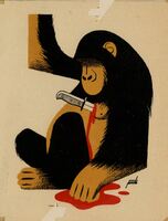 ASESINO DE MONOS. En el centro de esta composición se ha dibujado a un mono sentado de color negro y marrón al que se le ha clavado un puñal en el pecho. De su herida brota la sangre. En el dibujo está presente la firma del pintor.Prueba de imprenta. Ilustración realizada para la revista semanal Novelas y Cuentos. Titulo: Asesino de monos. Autor: Elizabeth Ferrars. Nº publicado:1075. Fecha: 16- 12-1951. Tomo NC. 36.
