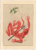 ARREPENTIMIENTO Representado en esta imagen un diablo rojo cae del cielo con su tridente. En la parte superior aparece una paloma de color verde. Todo el dibujo enmarcado está sobre un fondo claro. Bosquejo de la firma en la parte inferior derecho.Boceto realizado para la ilustración de la revista semanal Novelas y Cuentos. Titulo: Arrepentimiento. Autor: George Eliot. Nº publicado: 958. Fecha: 13-09-1949 Tomo NC. 17. PI/. 297.