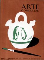 Arte Comercial 2 Sobre un fondo de color tierra oscuro, la imagen central de un botijo en blanco con una pareja de pingüinos en verde junto a un pincel de mango negro cuyos pelos están cubiertos de pintura verde.