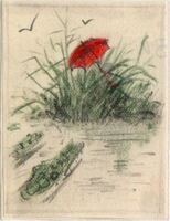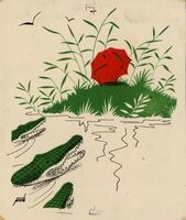 AVENTURAS DE TRES RUSOS Y TRES INGLESES. Se aprecia el paisaje de un lago de aguas transparentes de las que emergen dos cabezas verdes de cocodrilo que se dirigen hacia la orilla con grandes hierbas ante la visión de una sombrilla roja, en la parte superior izquierda y6 centro se dibuja com las alas de unos pájarosBoceto realizado para la ilustración de la revista semanal Novelas y Cuentos. Titulo: Aventuras de tres Rusos y tres Ingleses. Autor: Julio Verne. Nº publicado: 1260. Fecha : 03-07-1955. Tomo NC.: 44. PI/. 199