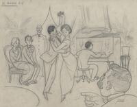 Baile de salón Dibujo que representa la escena de un salón, donde en el centro está bailando una pareja que son observados por diferentes personajes, al fondo un hombre de espaldas tocando el piano y en primer término la cabeza de perfil de un hombre con bigote que con su mano señala a la pareja.