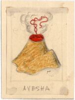 AVESHA. En este dibujo ligeramente enmarcado en el que se incluye una inscripción con la palabra “Avesha” vemos la figura de un volcán de aspecto amarillento en erupción. De su orificio se ve la lava de color rojo y el humo por el efecto del calor con la forma de líneas rojas y grises. El artista ha firmado su obra.Boceto realizado para la ilustración de la revista semanal Novelas y Cuentos. Titulo: Avesha. Autor: H. Rider Haggard. Nº publicado: 1097. Fecha: 18-05-1952. Tomo NC.: 25