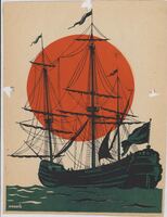 Aventuras de Forster el Marino En un cielo claro se vislumbra un gran sol rojo. En primer plano una carabela negra con algunas velas desplegadas y grandes mástiles navega sobre las aguas verdes del mar. El dibujo está firmado.Prueba de imprenta. Ilustración realizada para la revista semanal Novelas y Cuentos. Titulo:Aventuras de fostrs el Marino; Autor: Capitán Marryat; Nº publicado: 795 Fecha: 04/08/46; Tomo NC.:01