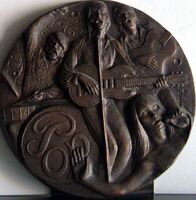 Baile Pop Fotografía del bajorrelieve de una medalla que representa al grupo mítico inglés Los Beatles que revolucionaron el panorama musical de la época, en primer término la cabeza de una de sus fans y detrás el vocal con una guitarra junto al batería y otro guitarristas.Serie de Manolo Prieto Anverso Baile Pop Otros archivos: Mbo/354 MEN/1828 MEP/1747 MG/1741. Esta medalla fuew espuesta en Exposiciones realizadas por laFIDEM